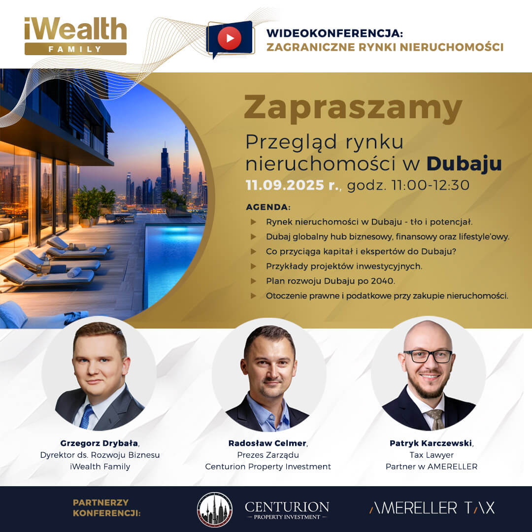 Już 11 września (czwartek) o godz. 11:00 zapraszamy na webinar, podczas którego eksperci: Radosław Celmer, Prezes Zarządu Centurion Property Investment oraz Patryk Karczewski, Tax Lawyer, Partner w międzynarodowej kancelarii prawno-podatkowej AMERELLER opowiedzą o tym: